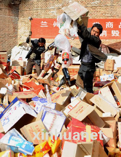 3月13日,兰州市酒类商品管理局销毁18种假冒伪劣酒7200余瓶。这次销毁采用“绿色销毁法”,工作人员将假冒伪劣酒一一砸毁,对废酒箱、酒盒、碎玻璃等进行回收利用,以避免采用“焚烧销毁法”对大气造成污染。3月13日,兰州市酒类商品管理局销毁18种假冒伪劣酒7200余瓶。这次销毁采用“绿色销毁法”,工作人员将假冒伪劣酒一一砸毁,对废酒箱、酒盒、碎玻璃等进行回收利用,以避免采用“焚烧销毁法”对大气造成污染。