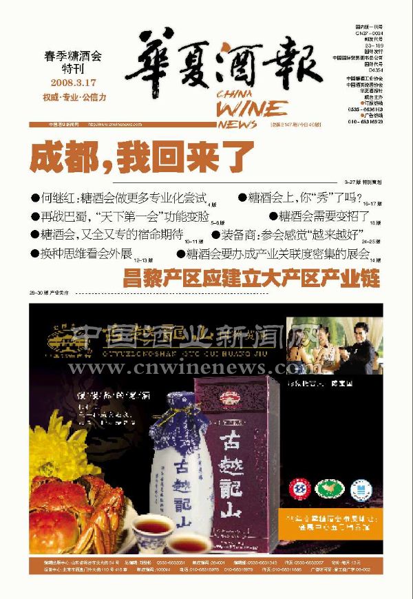 2008年全国春季糖酒商品交易会将于3月21日在四川成都召开。《华夏酒报》作为中国酒类行业惟一一份经国家新闻出版总署批准、全国公开发行的专业报纸,一直积极参与糖酒会的宣传工作。
