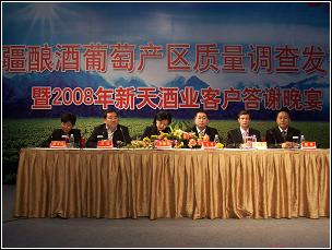 据了解,出席昨天晚宴的有中国酿酒工业协会领导、新疆维吾尔自治区领导和新天酒业董事长李新萍、总经理苏斌等高层人士等。新天酒业的法国酿酒师弗莱德就西域沙地98葡萄酒、新天尼雅梅鹿辄、2001干红葡萄酒、新天尼雅五星至尊、新天解百纳、新天天池酒园等产品进行了逐一介绍。苏斌总经理透露,2007年新天葡萄酒的出口实现了大幅增长,年初与荷兰航空公司签订了200万原酒及成品酒出口合同,成功登陆了荷兰航空公司260条航线;目前,新天葡萄酒在法国已经进入388家餐馆,2008年计划进入500家餐馆;新天酒业作为一家上市公司,2007年已经成功实现了扭亏为盈的目标,2008年将再接再厉,使新天葡萄酒的销售再上新台阶。