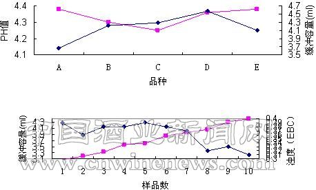 啤酒缓冲性,是指在其pH范围内具有一定的缓冲能力。而啤酒缓冲容量是衡量啤酒缓冲能力的大小。本文主要从啤酒的缓冲体系组成和缓冲体系两方面,对啤酒pH值以及缓冲容量、浊度之间的关系进行跟踪分析。 啤酒的缓冲性在一定程度上决定了成品啤酒的pH值,并控制成品啤酒的pH变化幅度。当啤酒pH从4.5降到3.9时,啤酒抵抗微生物的能力增加,非生物稳定性增加,风味稳定性降低。 啤酒或麦汁缓冲容量的定义:每100mL啤酒(麦汁)pH改变1个单位时,所消耗0.1mol/NaOH的毫升数。 在相同原料、料液比及相同糖化用水pH值下,通过改变糖化投料温度、蛋白质休止温度及两温度下的作用时间,研究糖化工艺参数对麦汁中缓冲物质含量及缓冲性能的影响。 在麦汁主要成分给定的情况下,影响麦汁缓冲容量的重要因素主要有水质、外加酸以及麦汁煮沸时间,同时,研究结果显示出缓冲容量愈大,高级醇含量愈高。麦汁的缓冲容量对啤酒中高级醇浓度有较大的影响,可以通过控制麦汁的缓冲容量来实现对发酵过程pH的控制。一般pH5.0的酸水糖化效果较好,较大缓冲容量的水质有利于麦芽的糖化;盐酸、磷酸和乳酸的使用能提高麦汁的缓冲容量;充分的煮沸可使其缓冲容量降低30%以上。 采用不同的啤酒品种以研究其缓冲容量与啤酒质量稳定性之间的相关性。同时,有针对性地提出了增加啤酒缓冲容量的措施,并对酿造过程中磷酸盐的主要来源进行了研究。研究结果表明,啤酒缓冲容量与啤酒泡持、浊度稳定性和老化速度之间存在着线性相关性。增加麦汁或啤酒中总磷酸盐浓度,既是提高啤酒缓冲容量的有效措施,又是减缓啤酒老化速度的重要手段之一。 1.笔者通过模拟啤酒中缓冲物质对啤酒pH的改变,试做如下实验: 1.1 K2HPO4单一对啤酒pH值的改变 样品:A啤酒,K2HPO4溶液:300mg/L,pH的变化范围:4.3~4.6(见表1) 从图1可看出,缓冲容量最大时,对应的缓冲体系汗斑量为0.65mL。也就是说,当啤酒中磷酸盐加入到一定程度时,啤酒的非生物稳定性最强。 1.2 KH2PO4单一对啤酒pH值的改变 样品:A啤酒,KH2PO4溶液:300mg/L,pH的变化范围:4.3~4.6(见图2) 从图2可看出,KH2PO4单一对啤酒pH值的改变中,缓冲容量最大时,对应的缓冲体系含量为0.69mL。 为进一步了解缓冲体系对啤酒缓冲容量的影响,并且合理推出当缓冲容量最大时,所添加缓冲物质的实际需要量,通过对多种缓冲体系同时进行啤酒的pH改变,看看啤酒缓冲容量最大时,消耗混合体系的物质量,并对此种啤酒的浊度进行分析,从而进一步了解缓冲性对啤酒风味稳定性和浊度之间的关系。找出最佳添加量,合理调整啤酒工艺,使啤酒中磷酸盐含量达到最佳溶出状态。 1.3 多种缓冲体系同时对pH的改变(见表2) 样品:A啤酒,K2HPO4溶液:300mg/L,KH2PO4溶液:300mg/L 通过表2可看出,单一的缓冲模拟体系对啤酒pH值改变较均匀,多种混合并存缓冲体系对啤酒pH值的改变,在两者量比例趋于1时,pH值改变较快,即随KH2PO4溶液(mL)和K2HPO4溶液(mL)量的接近。pH值变化幅度上升,随KH2PO4溶液(mL)和K2HPO4溶液(mL)量的远离,pH值变化幅度较平稳。并且当两种缓冲物质的量在0.4~0.6mL范围时,啤酒的缓冲容量相对较高。当两种缓冲物质分别为0.4mL和0.6mL时,此时缓冲容量最大。 1.4 多种缓冲体系浓度的改变对啤酒pH值的变化 样品:A啤酒,K2HPO4溶液:400mg/L,KH2PO4溶液:400mg/L 从表3可看出,随KH2PO4溶液(mL)和K2HPO4溶液(mL)量的上升,pH值变化幅度比较大,对应缓冲容量也相应增大,随着KH2PO4溶液(mL)和K2HPO4溶液(mL)量的上升,啤酒的缓冲性升高。但啤酒酒体改变使得啤酒风味可能发生变化。很明显,啤酒酿造过程中控制啤酒的磷含量也十分重要。化验室应加强对啤酒中磷的检测,以指导大生产时控制最佳啤酒的磷含量的工艺措施。 1.5 按上述方法测定不同啤酒的pH值对应的缓冲容量(见图3) 从图3可看出,缓冲容量在中档以上啤酒中大体相当,D、E是外厂啤酒,表明啤酒非生物稳定性相当。从化验室所做保质期看,5个月后,啤酒浊度反弹偏差不太大。并且在我厂中高档啤酒中,啤酒非生物稳定性趋于同一水平线上。当然,只有这些数据不足以说明和体现啤酒缓冲性。 1.6 缓冲容量与浊度的关系(见图4) 实验结果显示:随啤酒缓冲容量的增加,啤酒浊度呈下降趋势。 当啤酒中磷酸盐缓冲体系浓度在300~400ppm时,可以满足啤酒的缓冲要求。根据有关报道:有机酸、磷酸盐、天冬氨酸是影响啤酒缓冲容量的最主要因素,因而为提高啤酒缓冲容量可在啤酒酿造工艺过程增加含有天冬氨酸的多肽,或者增加麦汁或啤酒的总磷酸盐浓度。 由于增加天冬氨酸在啤酒储存中会形成风味老化物质,因此可通过增加总磷酸盐浓度来提高啤酒的缓冲容量。我们知道,磷酸盐来源于大米、酒花、麦芽。大米和酒花含磷较少,麦芽相对较多(见图5)。 为了增强啤酒非生物稳定性,除了要合理制定啤酒工艺,提高啤酒的保质期外,还可以通过添加相应的磷酸盐使啤酒缓冲性达到最大,进而提高啤酒的非生物稳定性。