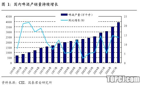 啤酒消费量在最近的十多年中一直保持了上升趋势,从1990年的692万千升到2007年3931万千升,17年的年均消费量的复合增长率达到了10.7%,快于白酒消费量的增长速度。进入2006年啤酒销量增长速度有所加快,2006年全年产销量增长了14%,2007年增长13.79%,预计全年的啤酒产量增长将超过13%。我们预计2008年国内的啤酒销售还将保持13%-14%的增长速度。