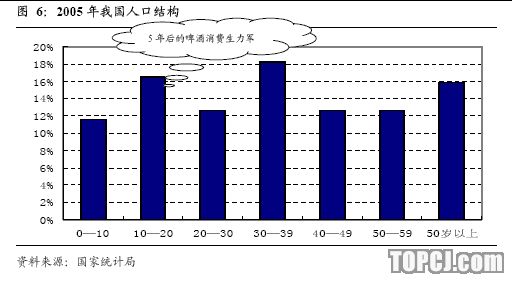 人口结构的变化。20-30岁的青年男性的啤酒消费量要高于其他年龄段的消费群体,这在国外的经验也得到了证明,美国二战后的婴儿潮在70年代推动了啤酒消费量的大增,而如今随着国家人口的老龄化,人均葡萄酒和蒸馏酒的消费量增加,啤酒的人均消费量在上世纪90年代以后开始下降,与此同时墨西哥和拉美国家年轻人口众多推动了啤酒消费的增长。从我国人口结构看,到2010年20-30岁人口占比将增加2个点左右,到2015年再增加接近2个点,这都有利于国内啤酒的销售,在经济情况不变的情况下,基本上可以保证未来5年的啤酒销量增长。