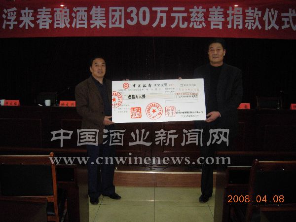 4月8日,“浮来春酿酒集团30万元慈善捐款仪式”在山东省莒县民政局举行。捐款仪式上,浮来春酿酒集团股份有限公司总经理侯和太代表董事长武玉杰向莒县慈善总会捐款30万元。