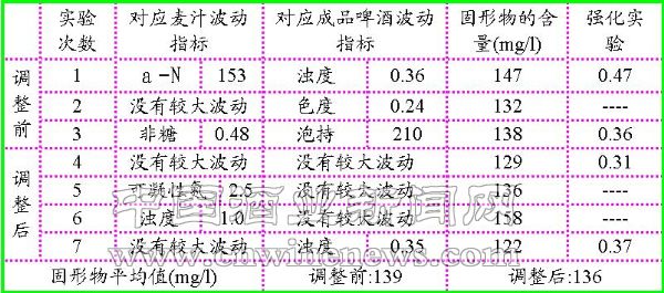 单从麦芽的变更情况看,虽然糖化麦汁部分指标有所波动,但麦汁固形物含量没有明显的改变。实验中固形物的含量虽有微小的差别,但成品酒指标比较稳定。