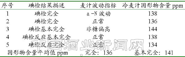 为了更加清楚地对固形物含量进行分析,笔者通过在糖化过程中的碘值测定,进一步通过数据确定冷麦汁固形物含量的关系,毕竟碘值是通过实验与仪器测定,以探讨糖化过程浸出时对固形物的影响,淀粉的分解与固形物含量的关系。糖化各阶段的数据分析见表4。