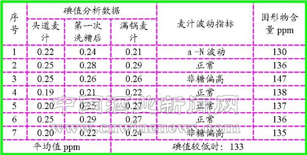 实验时,测量的结果都比较低,碘值相对变化较高的对麦汁指标波动影响不大,成品酒指标也基本正常。固形物含量有较大的上升趋势。碘检和碘值的综合指标反映出糖化效果的好坏,且在较大程度上影响了冷麦汁固形物的含量,且固形物含量较高者,将对成品的口味和浊度有一定的影响。碘值的变化与固形物含量没有太大的关系,但是头道麦汁的碘值相对高时,会影响后期洗糟和满锅麦汁的碘值,并且固形物含量也相对较高。因此,把头道麦汁的碘值控制在一定的区间内,在糖化工艺和操作过程中注意温度的波动、酶活性的有效释放和失活,可控制麦汁中糊精分子的分解,进而影响麦汁固形物含量。