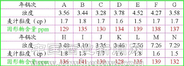 从实验的数据分析,冷麦汁固形物含量与头道麦汁的浊度、粘度没有直接的对应关系。可见,在后期洗糟和煮沸时,大量的可凝性物质将被驱除。