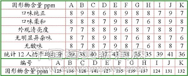从表7不难看出,影响分数的主要因素是酸味。随着固形物含量的不同,酸味的影响也不同,并且固形物含量高者,酸味相对偏高。固形物含量的高低,对其它品酒指标没有太大的影响。因此,可将固形物含量控制在136ppm以下。