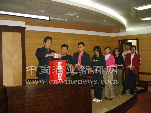5·12四川汶川发生地震后,灾区人民的安危一直牵动着《华夏酒报》每一位员工的心。作为中国酒类行业惟一一份专业报纸,在地震灾害面前,应该率先担负起媒体职责,义不容辞地通过各种方式为灾区人民贡献一份力量。图为5月13日下午,《华夏酒报》全体员工为灾区捐款现场。