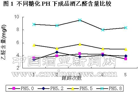 乙醛与双乙酰及H2S并存,形成嫩啤酒的生青味,赋予啤酒不纯正、不协调的口味和气味。从图1可以看出,成品酒乙醛含量随麦汁pH升高而上升。通常要求最终麦汁pH为5.2—5.5,使乙醛含量<10mg/L,否则,啤酒会呈现辛辣的腐烂青草味。