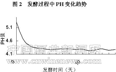 1.发酵过程中,啤酒pH由满罐麦汁5.2—5.5降至4.2—4.4。pH的下降,主要发生在起发阶段和对数生长阶段。酵母通过消耗磷酸盐、同化氨基等作用,在发酵前3—4天,使pH快速下降。在后发酵阶段,pH值下降速率明显趋缓,几乎保持恒定(见图2)。