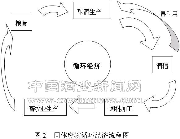 该公司建立了饲料加工车间,将白酒生产过程中的酒糟加工成高蛋白饲料,年产高蛋白饲料近万吨,产品销售收入1500万元。同时,公司结合传统白酒工艺的特点,利用一部分丢糟作为覆盖糟,生产复糟酒,年复糟酒产量为200吨左右,形成了“粮食生产→白酒生产→饲料加工→畜牧业生产→畜牧业产生有机肥→用于粮田果园”的循环模式(详见图2)。