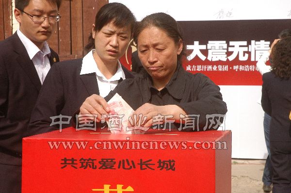 5月19日,内蒙古成吉思汗酒业“为了5·12特大地震的孤儿们”募捐活动,在公司清香型白酒生产基地呼和浩特市制酒厂露天广场举行。这次活动是中国青少年发展基金会在内蒙古自治区与内蒙古企业第一次联合举办的大型募捐行动。成吉思汗酒业400余名各族员工参加了本次活动并积极为灾区捐款,这次募捐所得款项将全部用于中国青少年基金会“5·12特大地震助孤基金”援助行动。