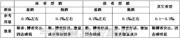 7.2.2 窖香己酸乙酯,具有典型的四川浓香老窖酒风味的窖香,用量为1‰—2‰。它与天然己酸乙酯搭配使用,窖香舒适,浓香醇正。