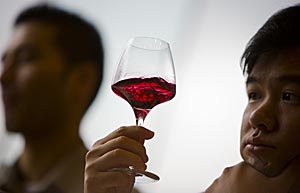 一名男子在品尝参展的红酒 本周二,2008国际葡萄酒及烈酒商贸展(Vinexpo)在香港开幕,这一年度盛会在法国波尔多地区以及纽约与香港等城市之间轮流举行。今年有来自32个国家的692家展商参会。香港政务司司长唐英年(Henry Tang)在致开幕辞时表示,香港已经拥有世界级的基础设施、物流、所需的金融与通讯系统,更为重要的是,香港拥有成为亚洲红酒贸易与分销中心所必须的品酒鉴赏力与旺盛需求。