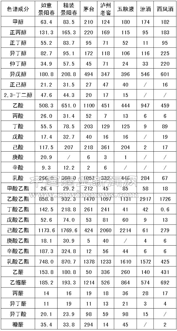 我们利用6890精密色谱仪对如意景阳春、精装景阳春及不同香型的代表酒进行了分析对比(见下表)。从分析结果的对比上看,景阳春的醇、醛、酯类成分比同香型代表酒的含量低,而有机酸类含量却相差不大。
