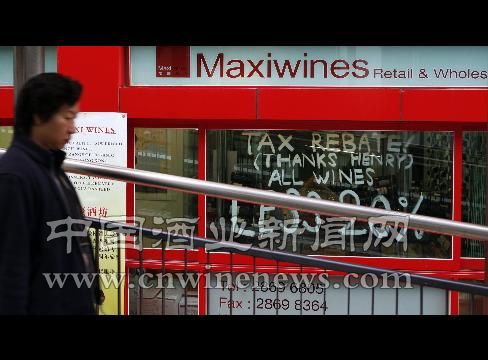 A wine shop advertises a sale after the tax cut in Hong Kong, Feb. 28, 2007. Photograper: Tim O'Rourke/Bloomberg News