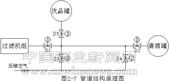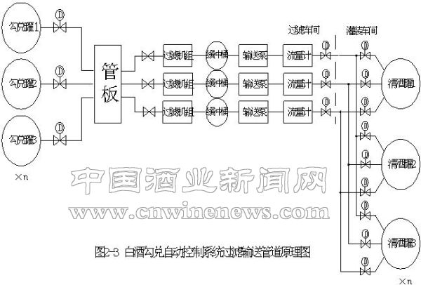 每个勾兑罐单独铺设一条管道至管板,通过管板分配后,分别进入过滤机组。每3套过滤机组对应一个生产车间(12台计量罐)。