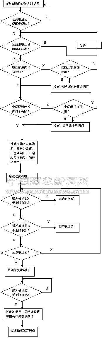 过滤控制可以在工程师站和过滤操作员站进行控制,操作只需要在计算机上选择过滤的原酒罐(勾兑罐)和输送的清酒罐,系统将自动完成相应阀门的开启和关闭,并根据缓冲桶的液位自动开启输送泵。