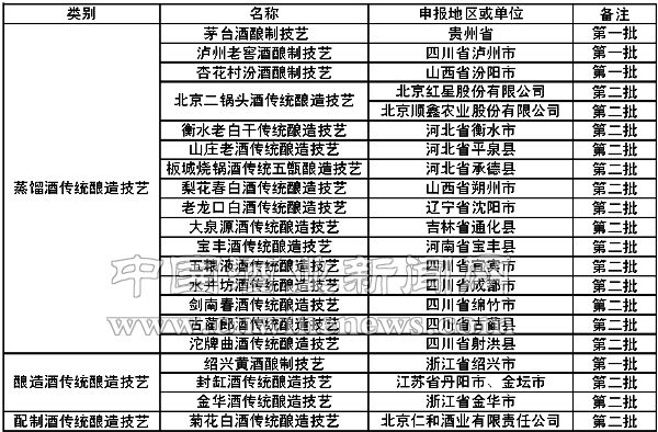 《华夏酒报》记者了解到,首批入选的4种酒类项目包括贵州的茅台酒酿制技艺、四川泸州老窖酒酿制技艺、山西杏花村汾文章来源华夏酒报酒酿制技艺、浙江绍兴黄酒酿制技艺。第二批的16种酒类项目包括13种白酒、2种黄酒和1种配制酒。(详情见附表)