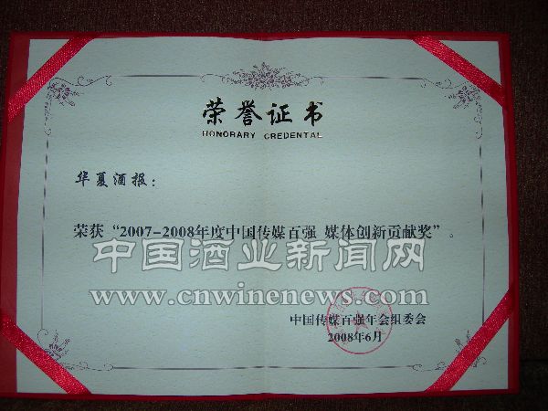 细雨绵绵,黄山含情。6月17日,“2007—2008中国传媒百强年会”在安徽黄山隆重举行。国内著名传媒学者、人民大学新闻学院副院长喻国明、央视媒介研究总经理姚林以及国内80余家媒体的高层领导出席了此次颁奖盛典。《华夏酒报》荣膺“中国传媒百强之媒体创新贡献奖”。