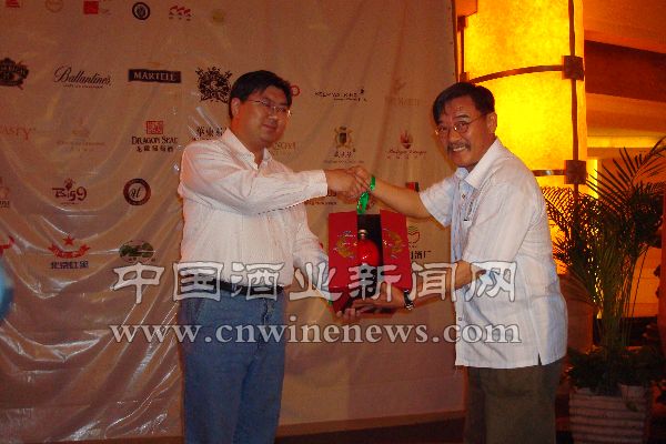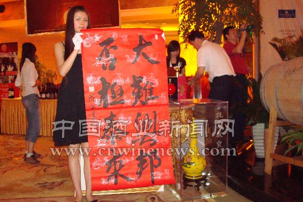 君顶东方世界艺术家08’赈灾慈善拍卖纪念酒最终以6500元成交,图为著名影星粤剧大王罗家英为该酒签名纪念。