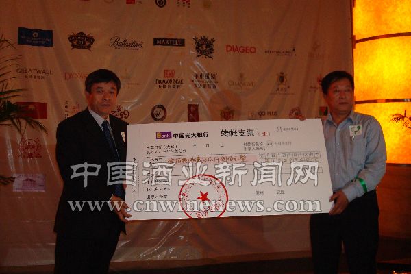 中国酿酒工业协会理事长王延才向中华慈善总会递交当晚名酒拍卖善款支票,共计1829800元。
