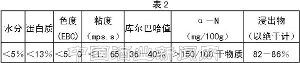 小麦芽一般蛋白质含量较高,色度偏深,没有皮壳,因而在酿造过程中会带来许多不便。一般宜选用蛋白质含量低、色度和粘度较低的原料(见表2)。