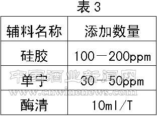 利用现有发酵大罐设备,按照现行工艺主酵6天左右即可开始回收酵母。零度时及零度后,每两天各排渣一次,以防止酵母自溶。零度后约3天左右进行倒罐,以去除过多的蛋白、多酚。倒罐辅料添加(见表3)数量依据原料及糖化情况而定。