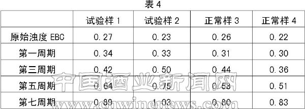 笔者选择了两组添加小麦芽的试验酒与不添加小麦芽的正常酒对照,做强化试验(见表4)。