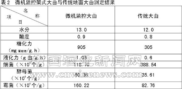 微机架式曲自动化程度高,可有效降低劳动强度。成品曲糖化力高,酒产量高。传统地面曲糖化力比架式曲低,但相比之下,液化力较高,产酒质量高,口感好,酒体丰满醇厚(见表2)。