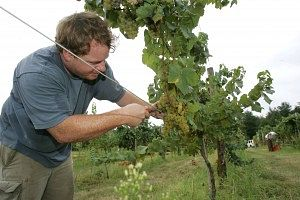 Andy Reagan harvests grapes by hand at Jefferson Vineyards.TH DAILY PROGRESS |