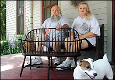 Ralph and Caron Quick — and their dog, Windsor — show off a child's settee made at the Windsor Chair Shop in Clarksville. |