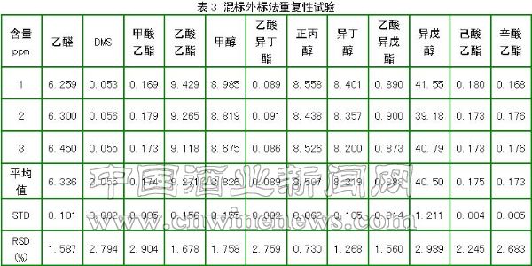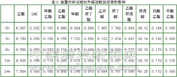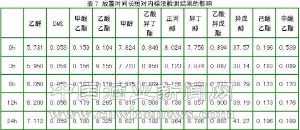 从表7可以看出,放置时间越长,检测结果差别越大,特别是如乙醛、乙酸乙酯、正丙醇、异丁醇和异戊醇等含量较大的物质,随着放置时间长短的不同,测定结果会随之升高。