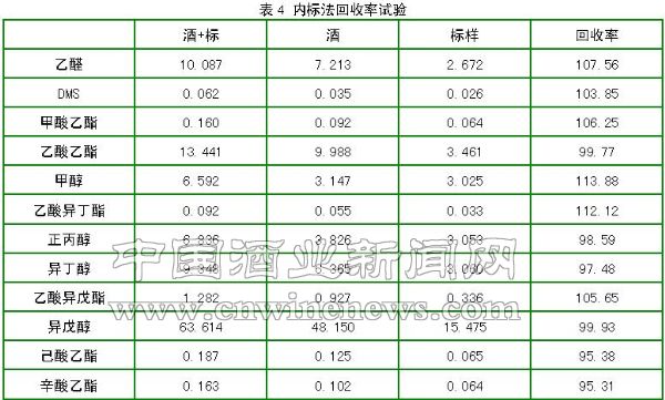 2.1 取5.0mL样品+0.1mL混标+0.1mL内标使用液,用内标法进行测定,计算回收率(见表4)