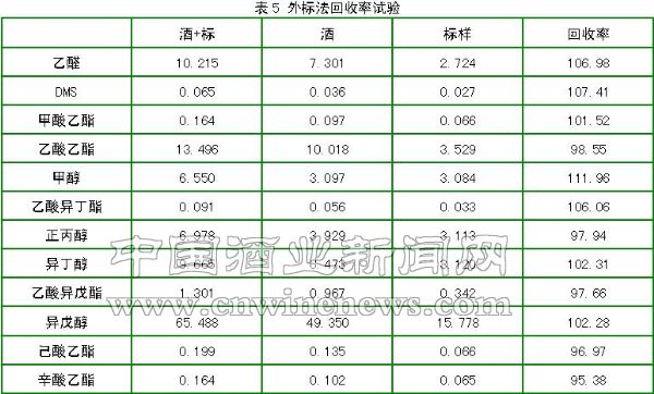 2.2 取5.0mL样品+0.1mL混标,用外标法进行测定,计算回收率(见表5)
