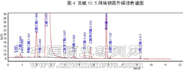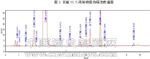 图3和图4是气相色谱法检测百威10.5度啤酒风味物质内标法和外标法色谱图。