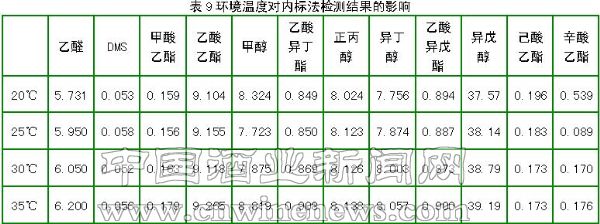 从表9可以看出,仪器室内温度越高,检测结果越不稳定,同时,乙醛、乙酸乙酯、正丙醇、异丁醇和异戊醇等含量较大的物质随室内温度的升高,测定结果亦随之升高。