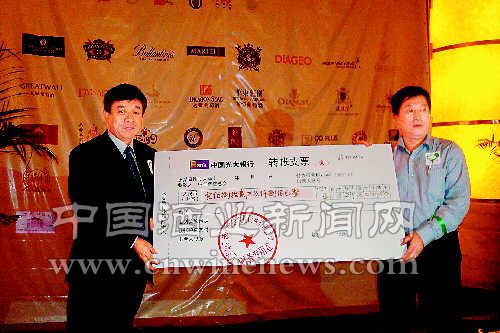 中国酿酒工业协会理事长王延才向中华慈善总会递交当晚名酒拍卖善款支票,共计182.98万元。