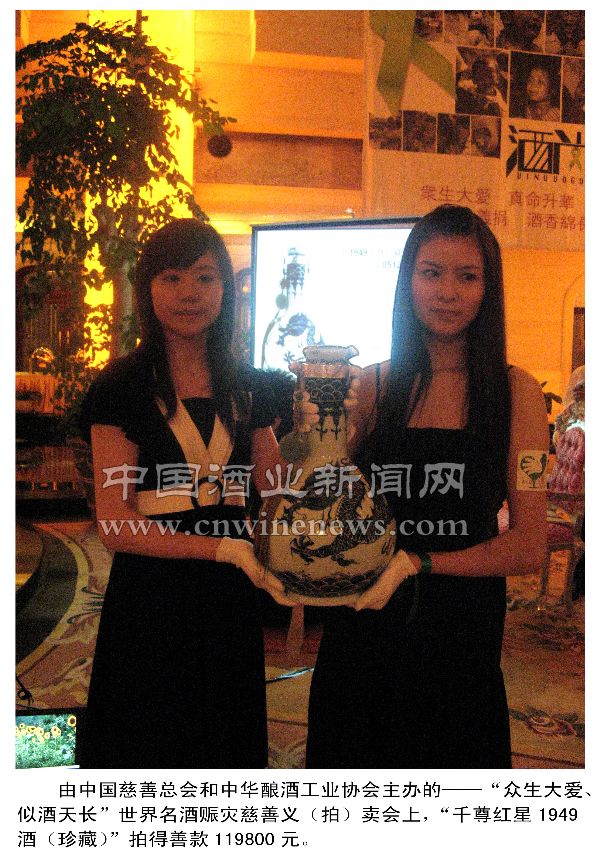 由中华慈善总会、中国酿酒工业协会主办的“众生大爱 似酒天长”6.1世界名酒慈善赈灾拍卖晚会,于6月1日在荣尊堡国际休闲会议中心举行。北京红星股份有限公司踊跃参加了此次义卖活动,奉献了公司精心酿制的千尊红星1949,并拍得善款近12万元。