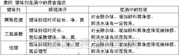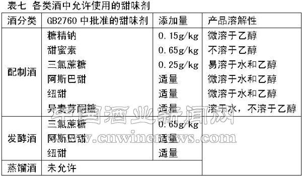 4.1 各类酒中法规允许使用的甜味剂(表七)