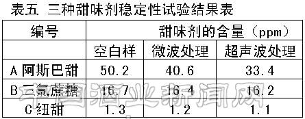 经微波和超声波处理后,测定酒中阿斯巴甜、三氯蔗糖、纽甜的含量,并与空白样进行对照,可见三者含量均有降低。其中三氯蔗糖含量变化幅度并不大,残留率均高于97%;纽甜次之,残留率在85%—90%之间;阿斯巴甜最不稳定,残留率为66%—80%。