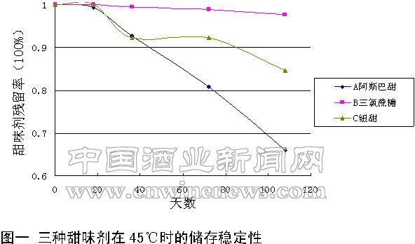 在45℃恒温储存条件下,测定不同储存时间后,新型白酒中三种甜味剂的含量。三氯蔗糖四次测定的数据与未处理前的含量变化不大,均高于98%,可见,三氯蔗糖在较高温度条件下有良好的稳定性。而阿斯巴甜和纽甜残留率分别是65%及84%,稳定性较差,推测可能是纽甜、阿斯巴甜分子上的苯丙氨酸甲酯与新型白酒中的酯和醇发生酯交换反应而使含量下降。