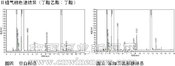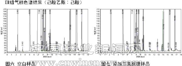 分别比较每组的实验结果,发现实验组和对照组气相结果基本一致:出峰的保留时间和含量都大致相同。可见三氯蔗糖在相对极端的条件下,没有和白酒中含量较高的乙酸乙酯、乙酸、丁酸乙酯、丁酸、己酸乙酯、己酸发生反应,从而说明三氯蔗糖在白酒中较为稳定。