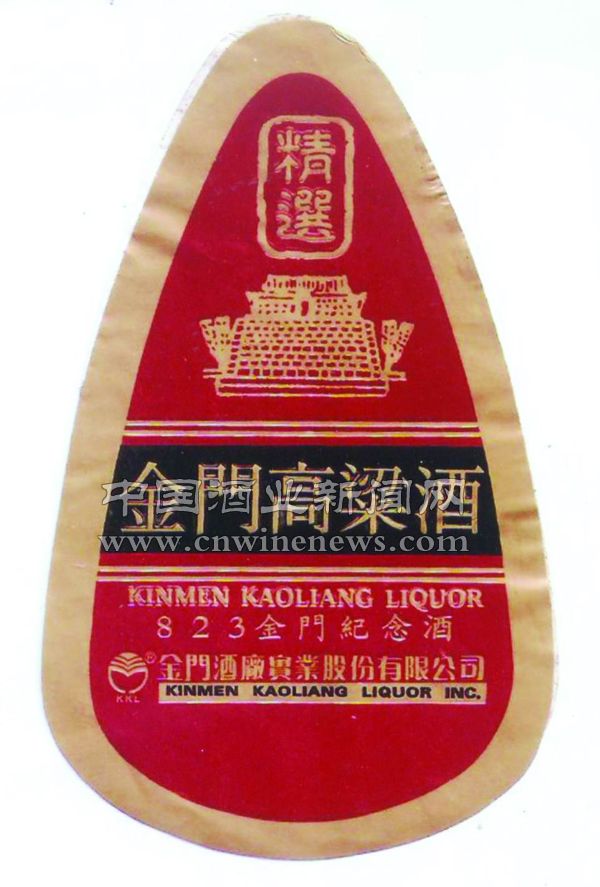 金门高粱酒标,大红底色。“金门高粱酒”五个楷书大字置于酒标中央。酒标上方有金门代表性的建筑物,两旁绘有高粱图案,突出了金门高粱酒的特色。酒标简朴雅致,洋溢着喜气洋洋的气氛,继承了中华传统文化的审美风格。