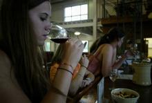 Jessica Kmitta, 22, of St. Louis, tastes the wine at Crown Valley Winery in Ste. Genevieve, Mo., on their limo tour of area wineries. |