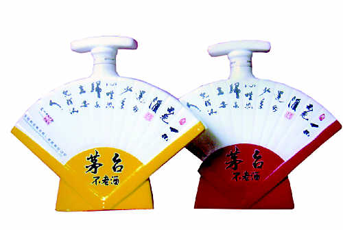 在白色的扇面上,分别书写着黑色的行书字体:“一杯不老酒,还我少年心,咋然归家去,妻儿错认人。”一语道出了茅台不老酒的神奇功效。