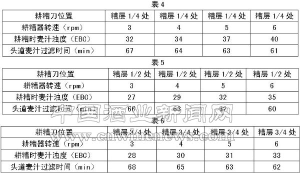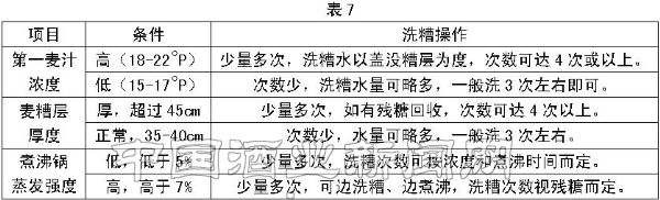 (1)洗糟操作的进行受麦汁原浓的高低,糟层厚度,麦汁过滤性能的好坏,以及煮沸强度高低的影响(表7)。
