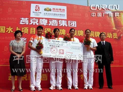 8月27日,与国家体育总局水上运动管理中心结为官方合作伙伴的燕京啤酒集团为中国奥运水上健儿举行了颁奖仪式,燕京啤酒集团董事长李福成和国家体育总局水上运动管理中心主任韦迪将共计570万元的现金支票交到了男子双人划艇冠军孟关良、杨文军,赛艇女子四人双桨冠军唐宾、金紫薇、奚爱华、张杨杨,女子帆板冠军殷剑等运动员手中。