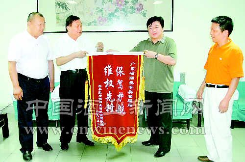图为孔府家公司董事长邱振新把“保驾护航、维权先锋”的锦旗敬送给广东省酒类专卖管理局,以表诚挚谢意。